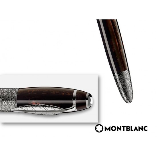 El anillo del cuerpo de la estilográfica y del cono rememoran el cosido de las pieles. Lujo y arte se unen en esta pieza única digna de los grandes coleccionistas de Montblanc. La edición limitada de escritores de 2014 de Montblanc es el espejo de la sofisticación y el arte. El opulento clip del capuchón reproduce una de las alas del amigo inseparable de Crusoe, el loro llamado "Poll".